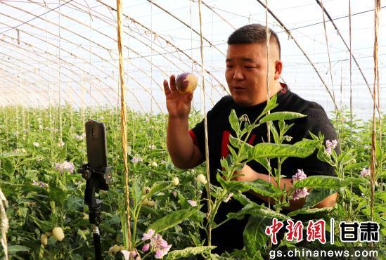 图为民勤“新农人”在日光温室里架起“直播间”,帮助果农销售人参果。马爱彬 摄