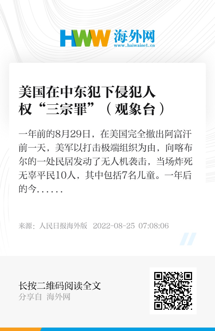 一年前的8月29日,在美国完全撤出阿富汗前一天,美军以打击极端组织为由,向喀布尔的一处民居发动了无人机袭击,当场炸死无辜平民10人,其中包括7名儿童。一年后的今天,阿富汗仍在美国遗留的阴影中艰难重建。阿富汗的遭遇,不过是美国祸害中东地区的一个缩影。