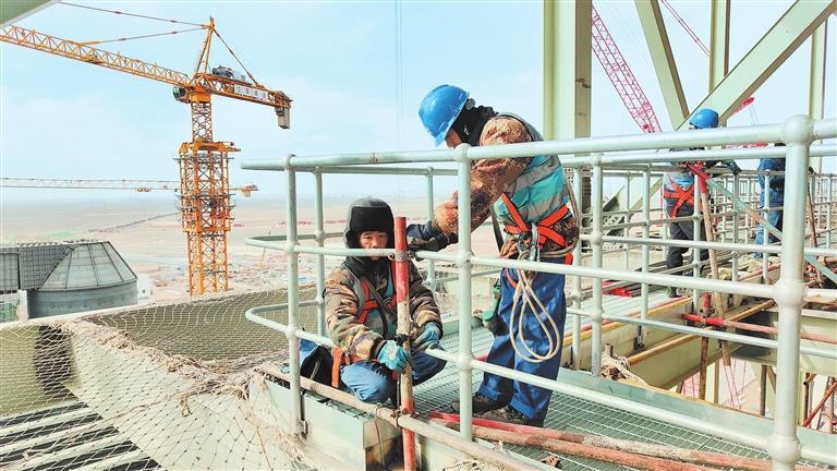 近日,位于瓜州县的甘肃电投常乐电厂项目工地上,工人正在加紧施工。(通讯员孙瑶)